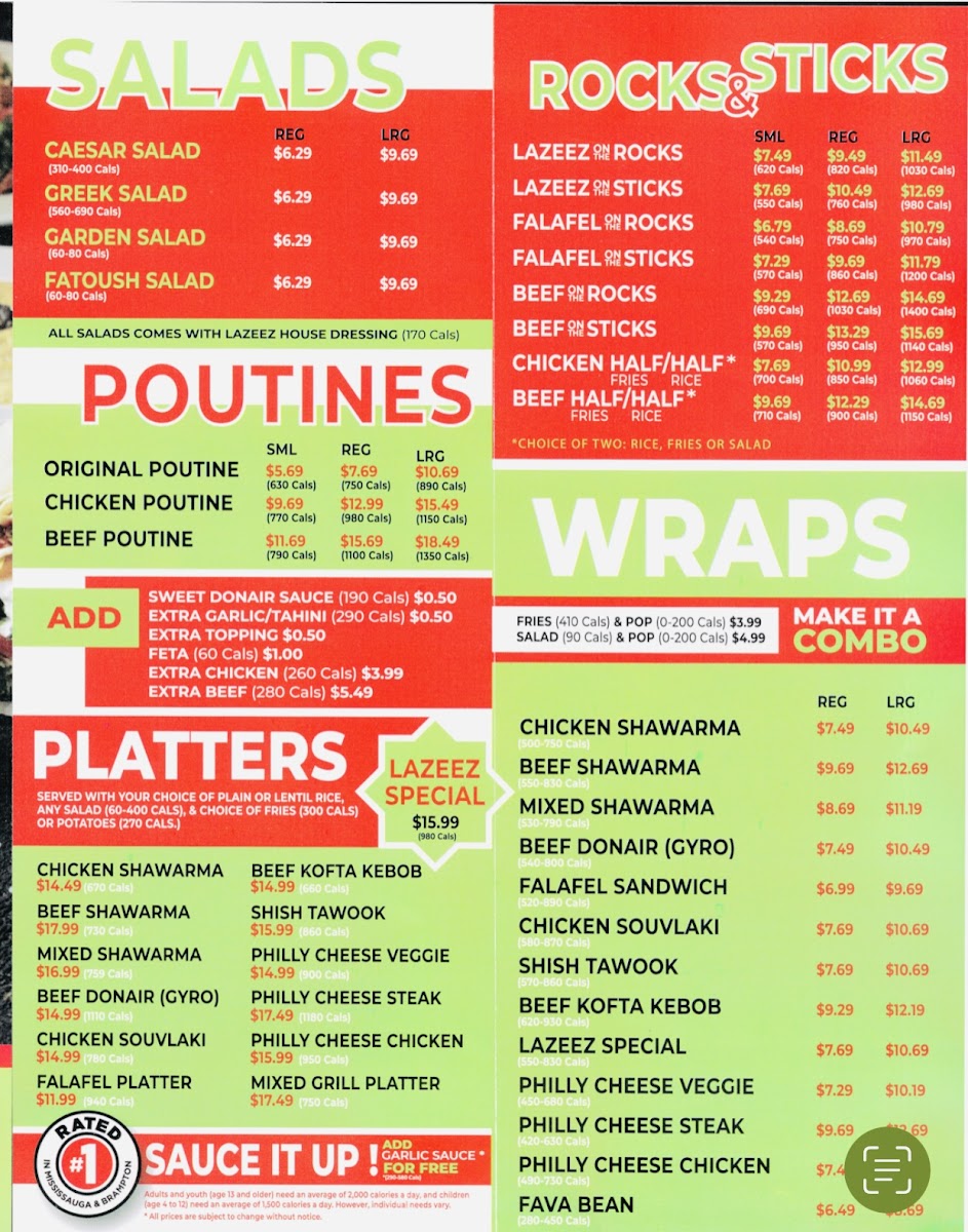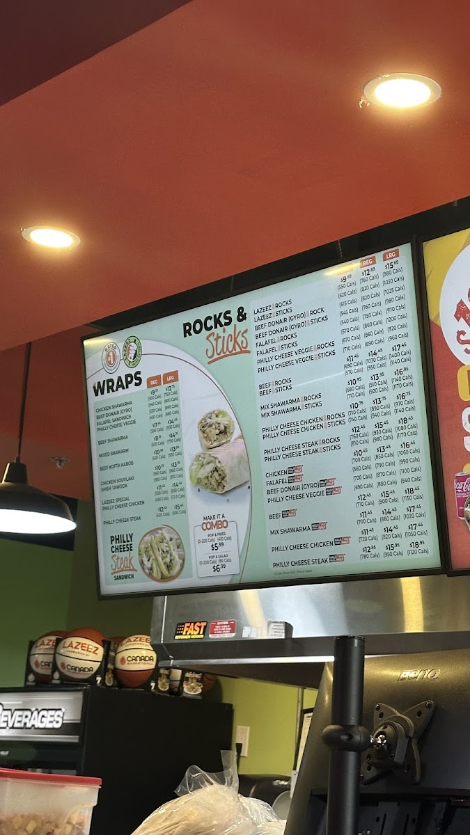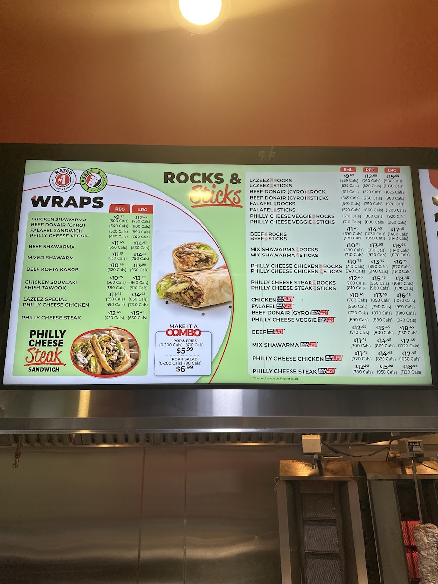 Don't miss out on their wraps and sandwiches, like the Lazeez Special Wrap with grilled chicken breast and fresh pineapple, or the Rocks & Sticks section featuring savory beef shawarma and sauteed tomatoes and onions.